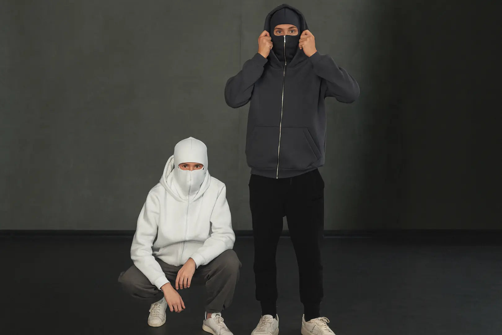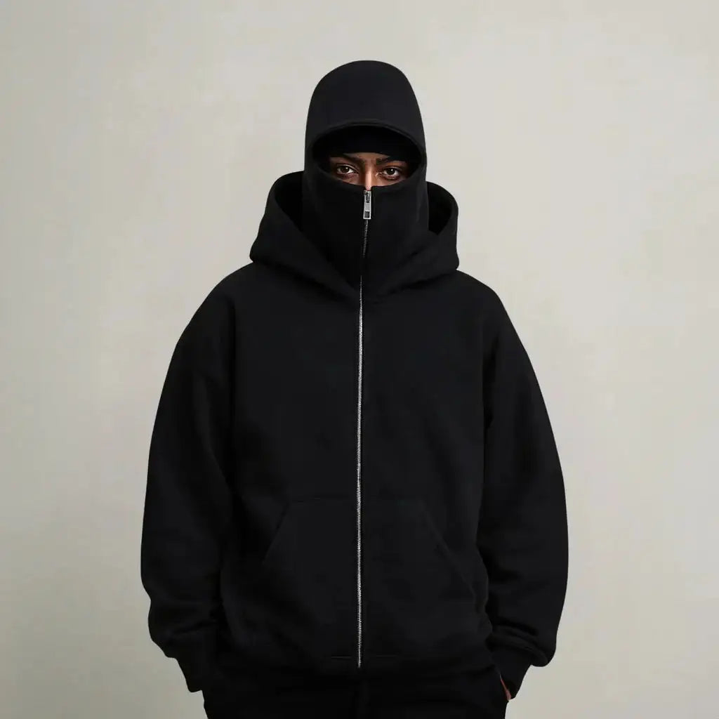 Ce n’est pas un simple sweat. C’est une pièce pensée pour l’attitude : cagoule intégrée, zip montant, coupe structurée, matières denses.